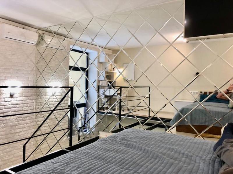 Использована квадратная серебристая зеркальная плитка размером 18х18.