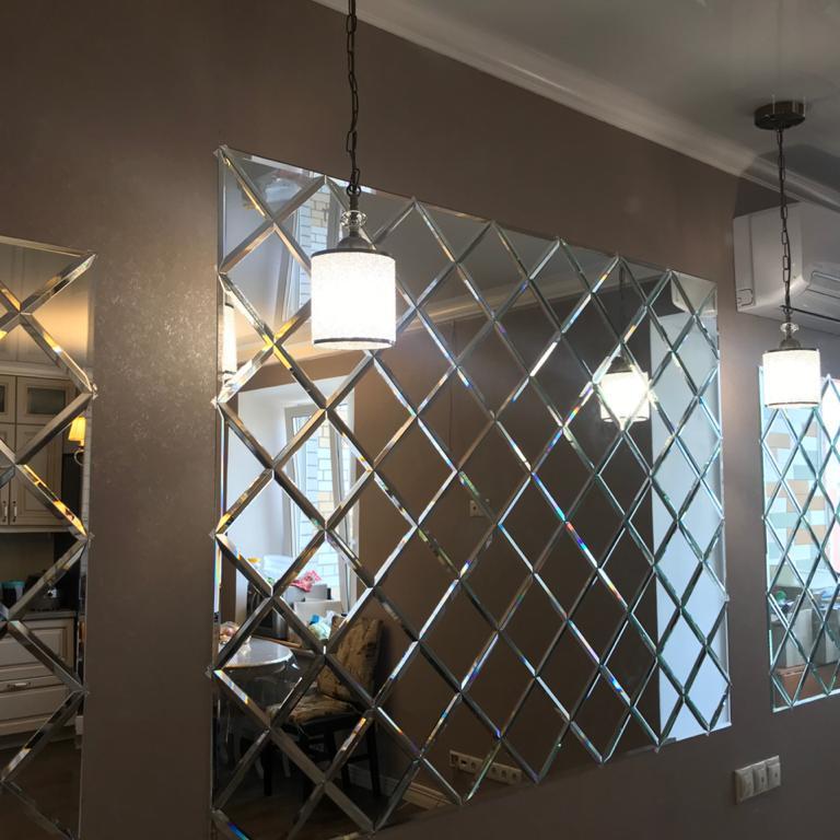 Использована квадратная серебристая зеркальная плитка размером 18х18.